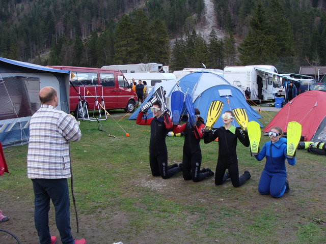 Der Himmel läßt schlimmes befürchten- nun schnell die Wohnwagen und Zelte aufbauen solange der Untergrund noch Trocken ist und man(n) und frau keine Schlamlöcher auf dem Zeltplatz fabrizieren. Am ersten Tag, also am 1. Mai 2008, wurde das langesame Aufwachen der unterschiedlichen Personen jäh unterbrochen, als sie den Hang gegenüber des Zeltplatzes anschauten. Ist dort Puderzucker oder Schnee auf den Spitzen der Tannen? Doch die weise Pracht war schnell wieder weg – zum Glück für die Nassen unter den Tauchern.