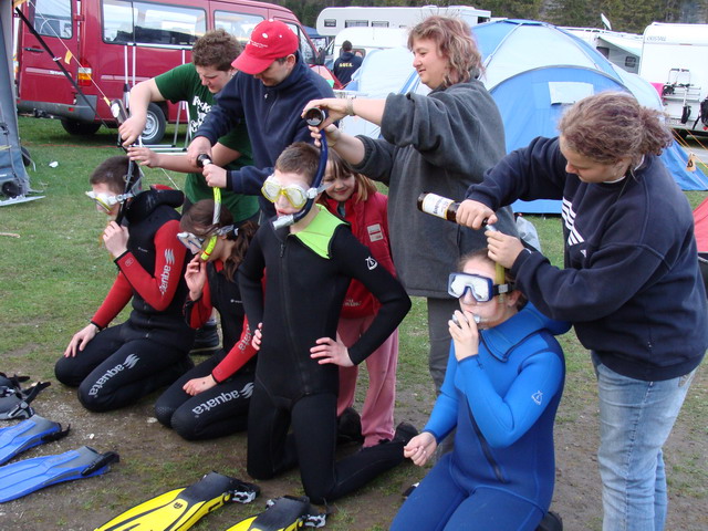 Am Samstag mussten sich die vier Neulinge zur Tauchertaufen in der Mitte des von den Fildersporttaucher Aichtal e.V. in Beschlag genommen Zeltplatz im Neopren mit Maske, Schnorchel und Flossen einfinden. Durch den Herrn der Meere – König „Neptun“ wurden die vier auf die Einhaltung des gelernten eingeschworen. Ebenso haben die vier neuen Taucher hoch und heilig geschworen ihren Tauchlehrern die Ausrüstung immer ans Wasser zu tragen. Die Zeremonie wurde vom Zeremonienmeister mit der Tauchertaufe beendet. Neben etwas reichhaltigen zum Essen durfte jeder über seinen Schnorchel einen guten Cocktail zu sich nehmen.