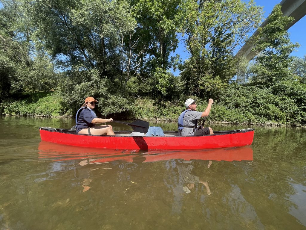 Während wir gemächlich dahinpaddelten, bot sich uns ein atemberaubendes Panorama: dichte Wälder, die sich am Ufer entlangzogen, das sanfte Plätschern des Wassers und ab und zu das Zwitschern der Vögel, die uns begleiteten. Immer wieder entdeckten wir kleine Wunder der Natur – Libellen, die über das Wasser schwirrten, oder ein Fisch, der sich aus dem Wasser sprang. Es war ein Erlebnis, das uns alle tief beeindruckte und uns einmal mehr zeigte, wie wertvoll unsere Natur ist.